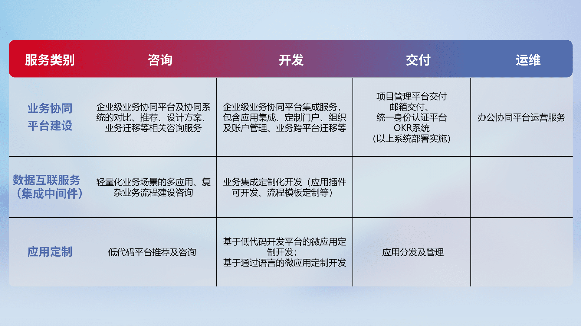 针对钉钉、、、企微、、、IDaas等平台级产品提供产品的规划、、、方案、、交付、、、、定制化开发等服务,,实现如统一协同办公、、、智能客户服务、、、混合会议管理、、、、智能数据查询、、、等业务场景,,,实现数字化转型。。。