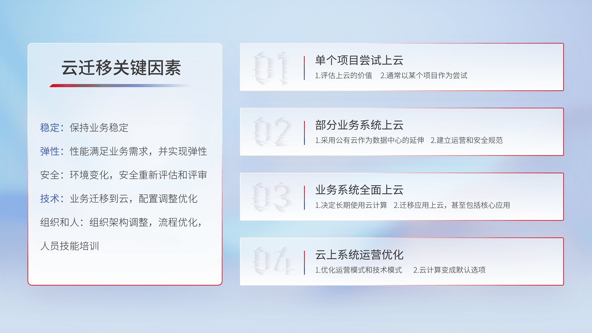 结合实际业务,,从规划设计、、、、云平台选型、、、、云原生改造、、、数据迁移、、、、集成交付,,,,迁移全过程为客户识别最佳上云路径,,,做好风险识别管理,,设计网络架构、、、身份权限、、、、安全审计合规、、操作审计、、、日志审计、、、、监控告警策略、、多站点容灾设计等,,,,对云上基础设施进行整体规划,,提升IT治理水平,,,以满足弹性、、高可用、、高性能的需求。。