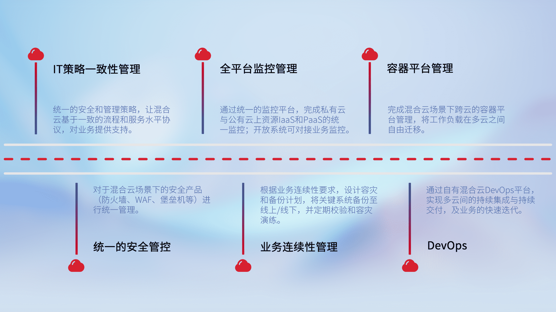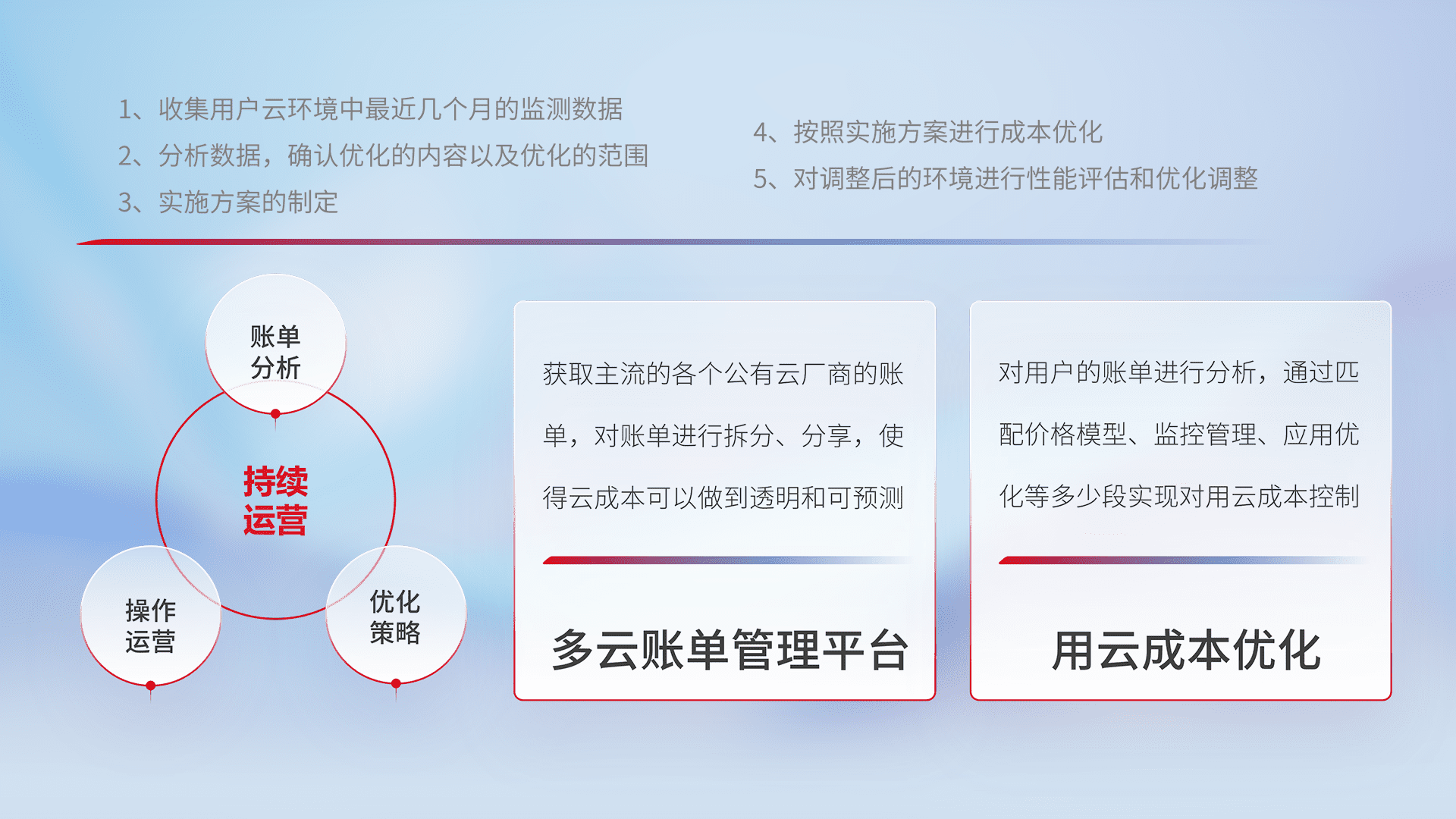 通过多云纳管,,,以统一的资源数据模型把客户的云资源进行抽象和封装,,,,进而实现对多云资源的统一操作,,,保障云资源管理的可靠性、、、、稳定性与可用性。。量身定制化运维内容,,配置、、、开发运维、、、补丁管理、、备份、、、、监控、、、、认证和访问管理、、、审计和日常巡检等,,,,保障在用云过程中的可靠度,,,稳定度以及高可用率。。。
