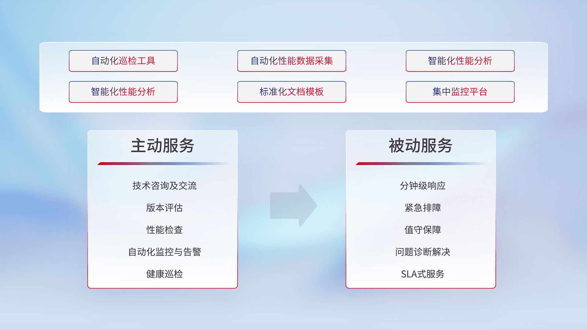 智能化工具和标准化文档,,,,保障服务质量,,提供主动服务(包含技术咨询、、、版本评估、、、、性能检查、、、、自动化监控与告警、、、健康巡检)和被动服务包含(分钟级响应、、、、紧急排障、、、值守保障、、问题诊断解决、、、SLA服务)。。。。